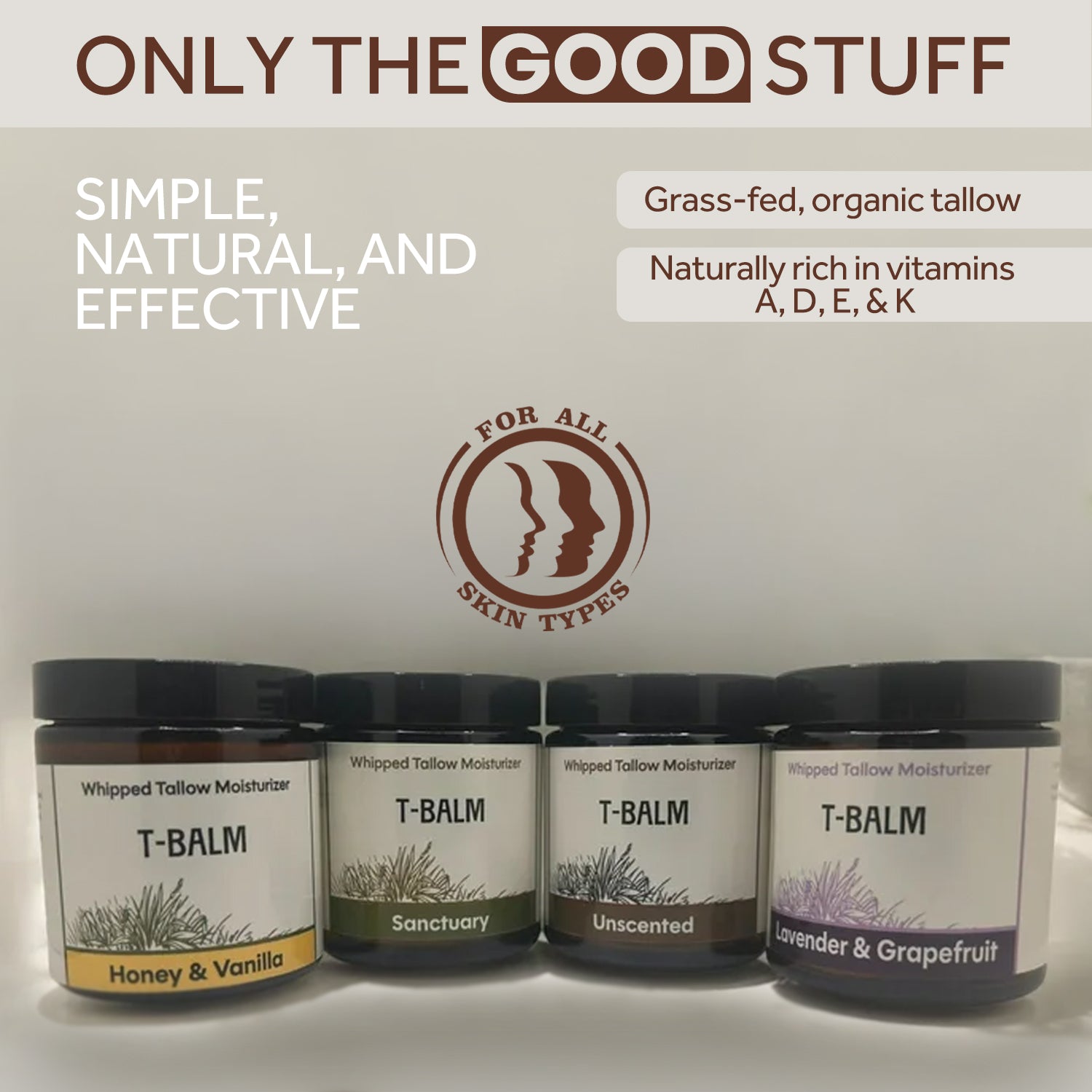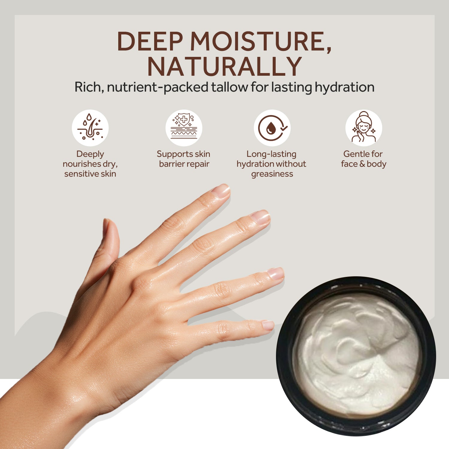 Whipped, grass-fed tallow rich in skin-supporting nutrients to deeply nourish, protect, and hydrate without feeling greasy.